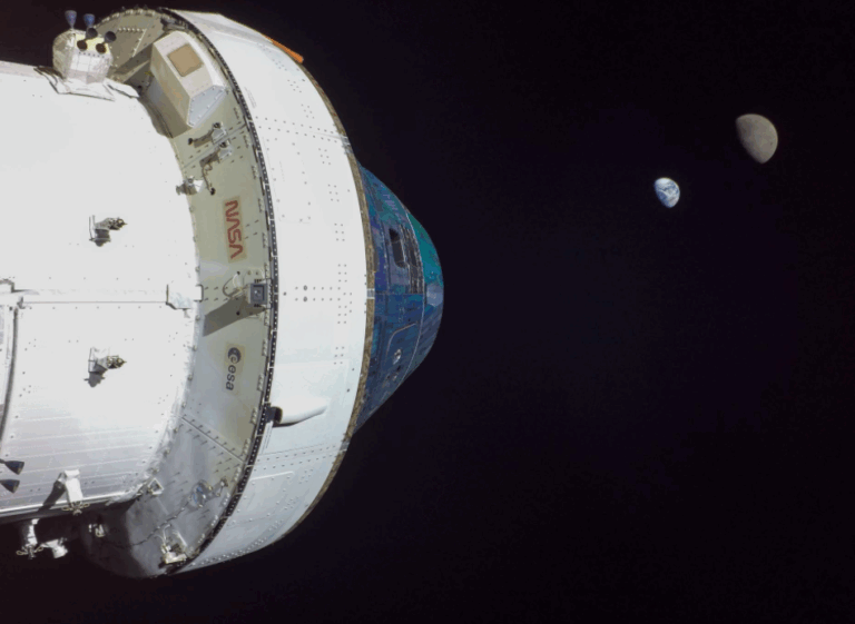 Uma foto da espaçonave Orion observando a Terra e a Lua da órbita lunar durante a missão Artemis I.